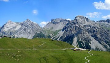 Panoramablick auf grüne Berge und felsige Gipfel unter blauem Himmel. | © www.wikipedia.com