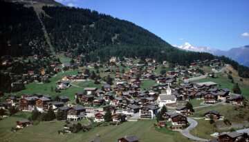 Panorama von Saas-Fee, Schweiz, mit Häusern und Bergen. | © www.wikipedia.com