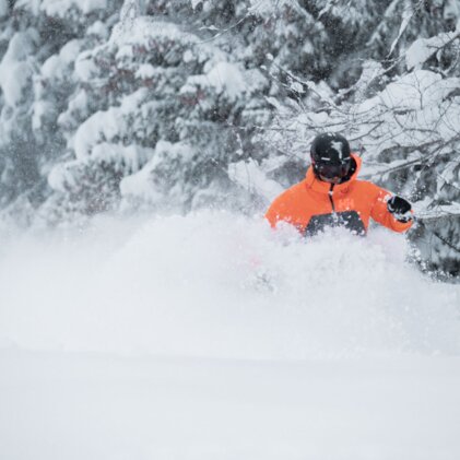 Skier in orange jacket skiing through deep powder snow. | © Tim Marcour Freeride
