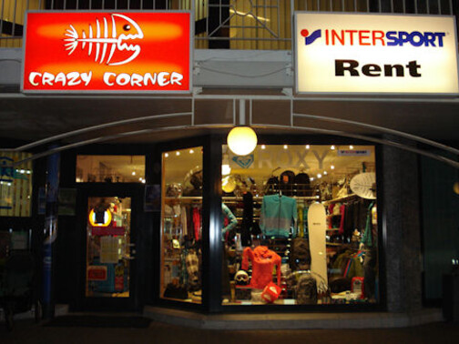 Storefront with 'Crazy Corner' and 'Intersport Rent' signs.