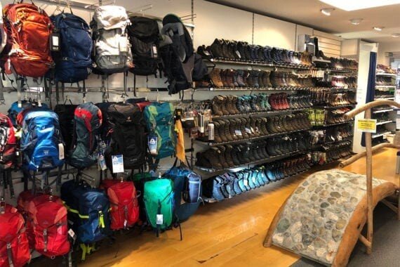 Rucksäcke und Wanderschuhe in einem Geschäft