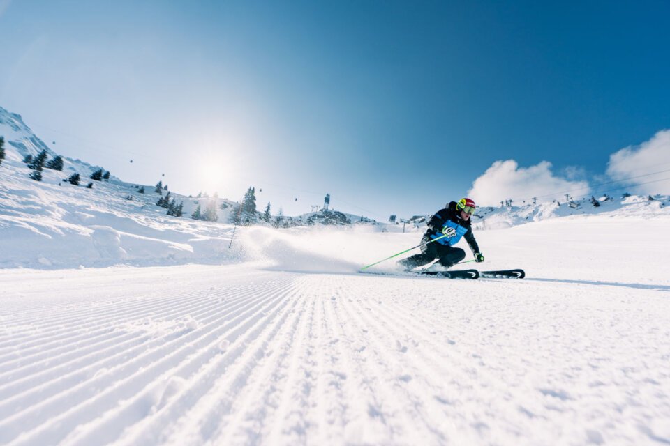 Skieur sur piste damée au soleil | © raphaelsurmont