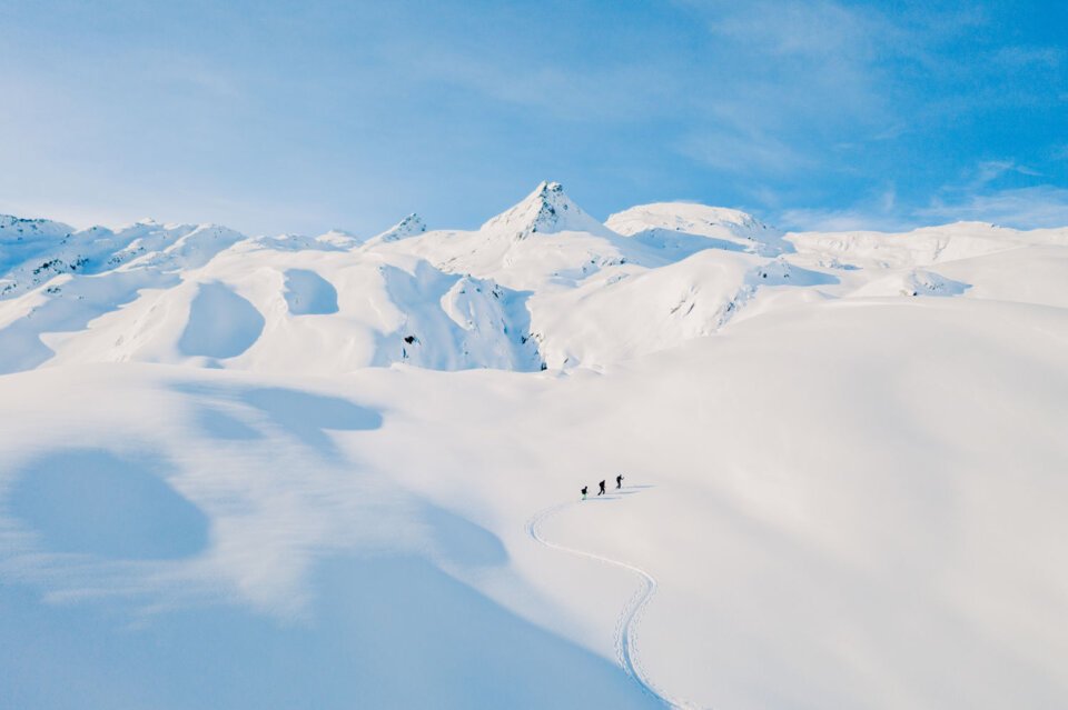 Skiemurs dans un paysage montagneux enneigé sous un ciel bleu. | © raphaelsurmont