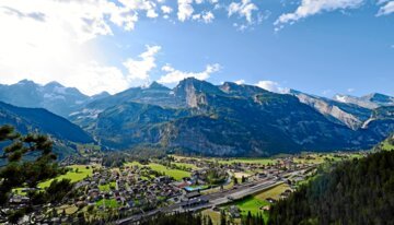 Vue panoramique d'un village suisse avec des montagnes et un ciel bleu | © Kandertal Tourismus