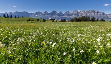 Prairie fleurie avec chaîne de montagnes par une journée ensoleillée. | © https://www.flickr.com/photos/flumserberg/