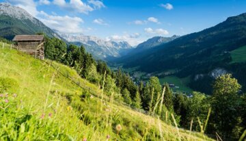 Cabane en bois sur un pré de montagne verdoyant avec un panorama alpin | © © Wagrain-Kleinarl Tourismus