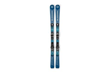A pair of Atomic Bent 90 skis with a colorful design and bindings.