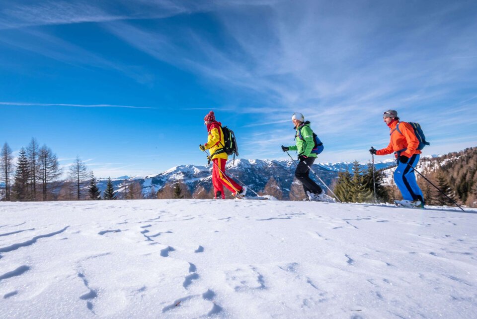 Drei Personen beim Schneeschuhwandern in den Bergen. | © Kärnten Werbung