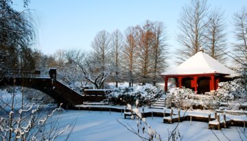 Winterlandschaft mit Brücke und rotem Pavillon unter Schnee. | © https://www.flickr.com/photos/mispahn/