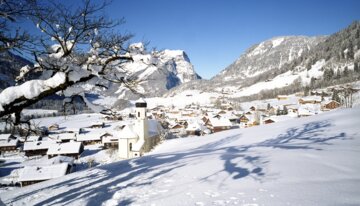 Winterliche Landschaft mit verschneitem Dorf und Kirche. | © (c) Christoph Lingg - Bregenzerwald Tourismus