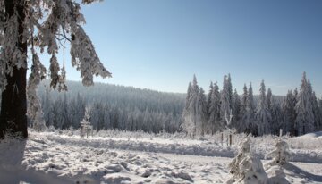 Verschneite Landschaft mit Bäumen und blauem Himmel. | © https://www.flickr.com/photos/oberhof/